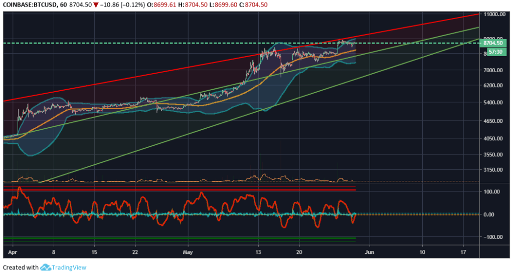 The crypto asset market is having a great month! Bitcoin’s strong performance has been leading it upwards starting May around $5,300 and almost hitting $9,000 before fading back to around $8,700 at the time of this writing. Month-to-date that puts Bitcoin’s return on investment over 60 percent, not to mention, it’s up over 130 percent year-to-date. The uptrend that I spoke of last month is still very much intact, and I’m very confident in the bull case for bitcoin in both the short and long-term time frames. Three basic scenarios that can imaginably play out over the next month in order of likelihood would be: (A) The rally continues to play itself out with institutional and retail FOMO sends Bitcoin over $10,000 before mid-June; (B) Prices capitulate back to a support between $8400 and $7700 before moving higher and pushing across $9,000 to test $10,000 in late June; (C) The worst-case scenario breaking the trend with a drop in prices that sink well below $7000. The logarithmic chart used to generate these predictions can be seen below with the same presets as last month for the bollinger bands and linear regression (R-squared = 0.93102207). The bull case for bitcoin’s long-term value proposition is rooted in its fundamentals, institutional interest, and increasing demand ahead of the block reward halving next year.