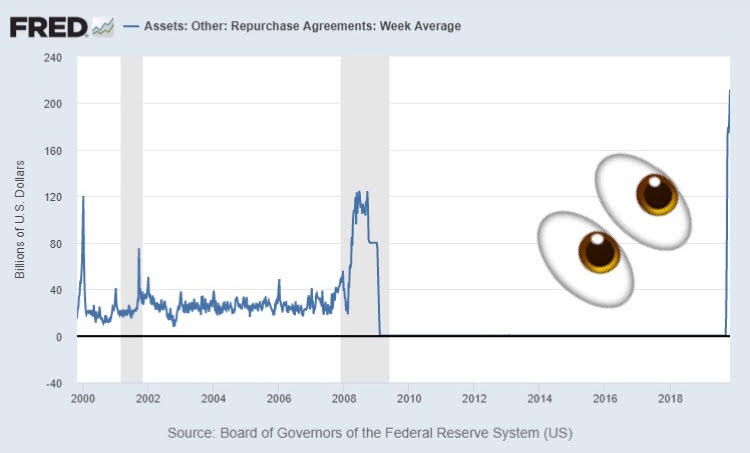 Seeing the need to step in and help steer things this September, the Federal Reserve central bank has come to the rescue investment banks again. Quickly injecting $278B into the securities repurchase (or “repo”) market over a four day period in mid-September according to Bloomberg. Just as that news had time to break and surface to investors as well as Wall Street, the New York Federal Reserve Bank injected another $49.7B into the overnight repo markets. This surreptitiously came ahead of the announcement that there was going to be another 25 basis point cut in the Federal Funds rate from 2.00%-2.25% down to 1.75%-2.00% as part of a “not QE, mid-cycle adjustment” as to match the European Central Bank (ECB) and other central banks around the world. Officials from the Fed voted on lowering excess reserve requirements as well as opened up the possibility of another cut this year too.