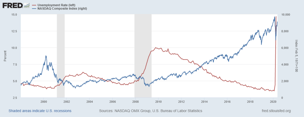 SOURCE: U.S. Bureau of Labor Statistics, Unemployment Rate [UNRATE], retrieved from FRED, Federal Reserve Bank of St. Louis; Link, May 20, 2020. NASDAQ OMX Group, NASDAQ Composite Index [NASDAQCOM], retrieved from FRED, Federal Reserve Bank of St. Louis; Link, May 20, 2020. Chart date range from January 1, 1998 to present. Shaded areas indicate U.S. recessions.