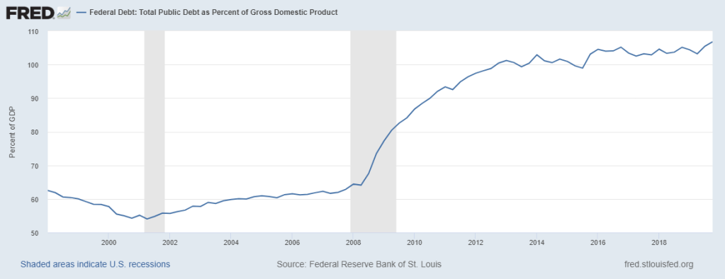 SOURCE: Federal Reserve Bank of St. Louis and U.S. Office of Management and Budget, Federal Debt: Total Public Debt as Percent of Gross Domestic Product [GFDEGDQ188S], retrieved from FRED, Federal Reserve Bank of St. Louis; Link, May 20, 2020. Chart date range from January 1, 1998 to present. Shaded areas indicate U.S. recessions.