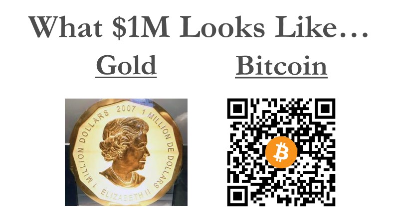 The image above provides a visual representation of the difference between what a one million dollar “coin” looks like between gold and bitcoin, and it helps illuminate the advantages and disadvantages for one over the other. Ironically, the giant gold coin pictured is one of six coins ever minted and was stolen out of a Berlin museum in March 2017 highlighting its vulnerability to physical theft.