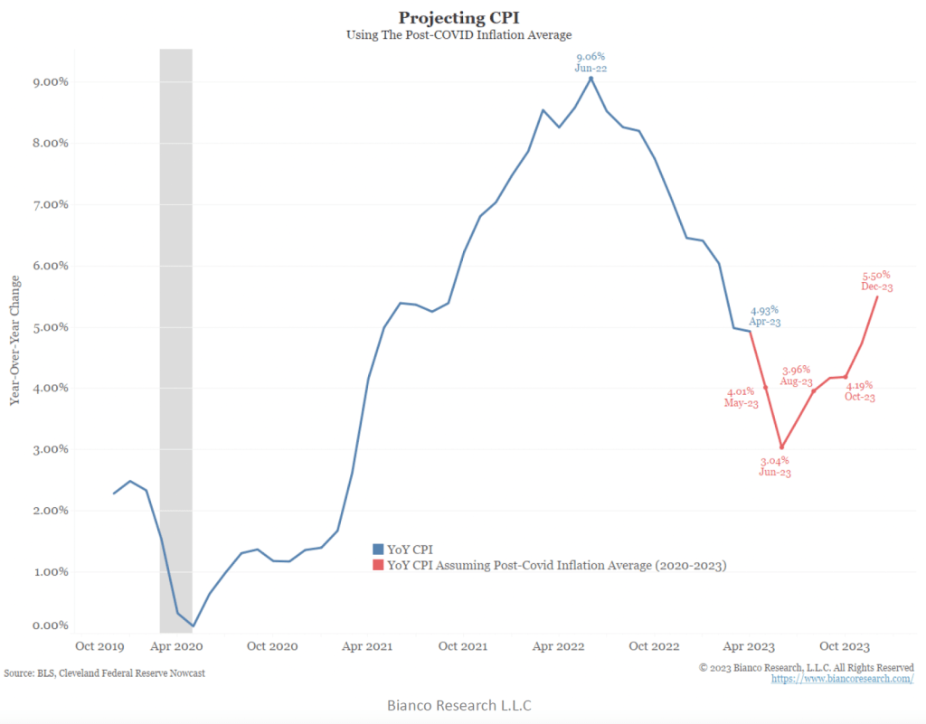 We’ve seen inflation coming down year-over-year but only because the rate of change has slowed down from 40-year highs last year, not because consumer prices have stopped inflating. If you take the monthly average of 0.4% on inflation since the beginning of 2020 and plug it in for the rest of the year CPI will start going back up in August, which is completely contrary to the narrative of the Federal Reserve raising interest rates to reduce inflation. So, at this point, it doesn’t matter which way the Fed goes with interest rates because it means that there will be more inflation regardless.